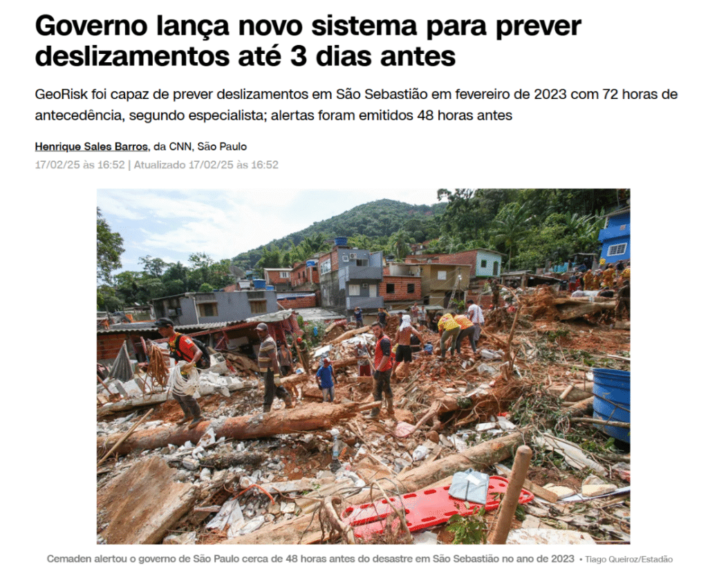Segundo a reportagem da CNN Brasil, o sistema GeoRisk “opera com a análise de inteligência artificial, diante de uma base de dados composta por informações de características geológicas e histórico de desastres em regiões monitoradas e pelos resultados gerados pelos modelos meteorológicos utilizados pelo Cemaden”, e “visa prever situações com potencial de desencadear deslizamentos de terra com antecedência de até 72 horas”.
